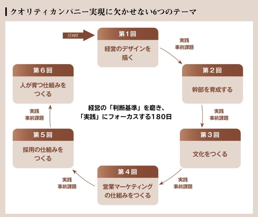 本プログラムは、経営の目的を「営利」とするのではなく、働く人を中心に、縁ある人の幸せを目指す高収益企業「クオリティカンパニー」を目指す講座です。