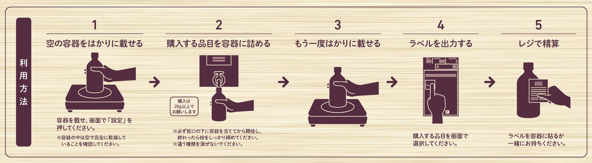 今回の取組みで量り売りするのは、ハンドソープ、ボディシャンプー、キッチン用液体石けん、洗濯用液体石けんの4品目です。持参した容器に液体を詰め、計量器で測って精算というシンプルな方法です。