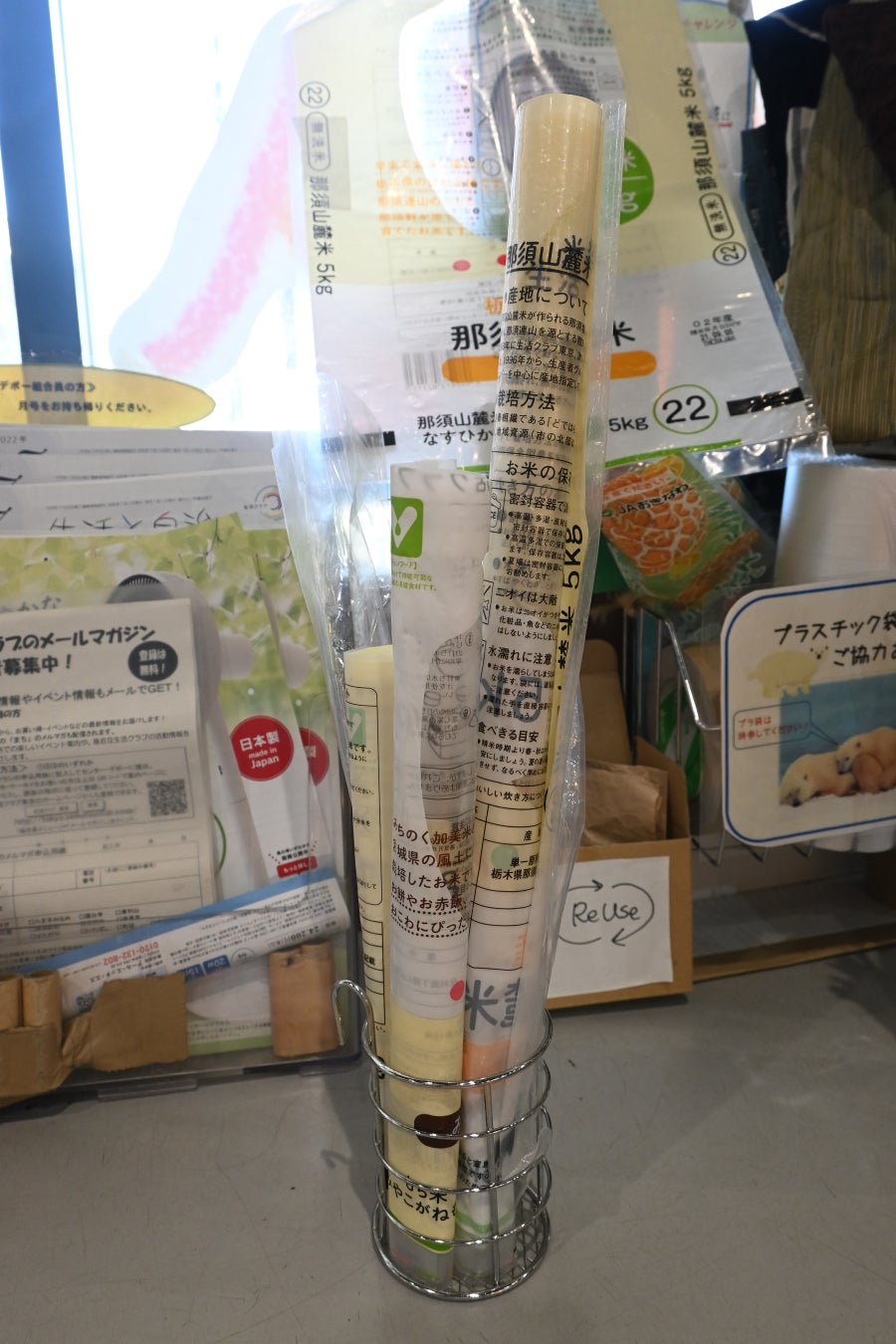 5&6番:お米が入っていたビニール袋は強度バツグンのため、上を開いて持ち手の穴を開ければレジ袋代わりに。お米を食べ終えた組合員が持ち寄って循環させながら使っています。