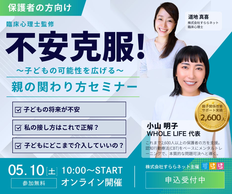 こうした背景のもと、株式会社すららネット(本社:東京都千代田区、代表取締役:湯野川孝彦)では、「不安克服!子どもの可能性を広げる親の関わり方セミナー」を、5月10日(土)にオンラインで開催いたします。心理学をベースに、臨床心理士と不登校生の保護者支援のスペシャリストが、家庭でできる子どもとの関わり方や、親の心の整え方について、具体的なケースを交えてわかりやすく解説します。