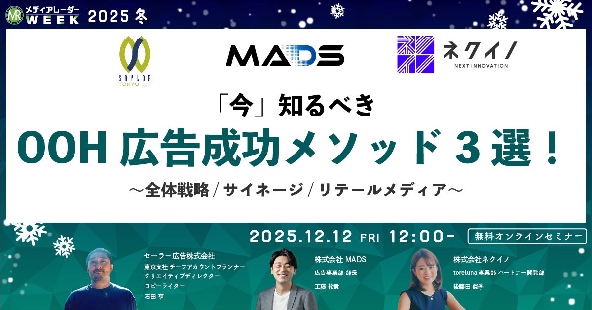 株式会社アイズ(所在地:東京都渋谷区、代表取締役社長:福島範幸、東証グロース:5242)が運営するNo.1*の広告業界のプラットフォーム「メディアレーダー」が主催するマーケティングセミナーイベント「第20回メディアレーダーWEEK 2025 冬」にて、サイネージ・OOHの専門家たちが12/12(金)に登壇します。視聴申し込みは無料です。