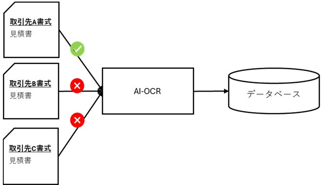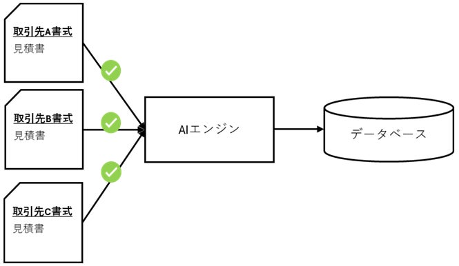 特許出願した「文書情報抽出システム及びプログラム」に関する新たなAI技術(以下、本技術)は、従来のOCR技術(紙の文書をスキャンして文字をデジタルデータ化する技術)の大きな課題であった「文書フォーマットの違いへの対応」を解決するものです。見積書・請求書・契約書など、企業活動で扱う様々な形式のビジネス文書に対して、テンプレートや専用設定を必要とせず、AIが自動的に文書構造を解析。データベース項目ごとに必要な情報を抽出・データ化します。