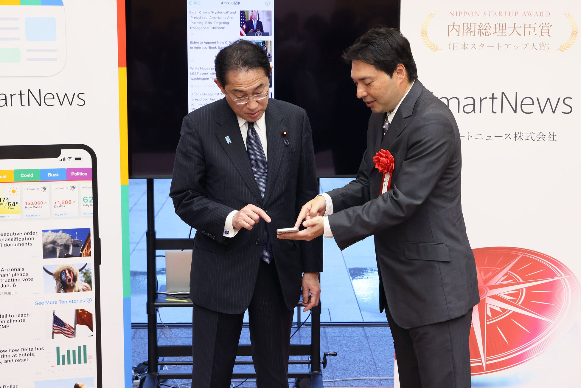 本日、総理大臣官邸で開催された表彰式では、岸田総理から「大賞の栄誉に輝かれたスマートニュース株式会社は、情報の偏り、社会の分断というグローバルな社会課題に対し、世界中の良質な情報を、必要な人に送り届ける、これを使命に、日本はもちろん、アメリカ等の海外市場に進出されています。本日お集まりの皆様のような、社会課題の解決を担うスタートアップは、正に、新しい資本主義の考え方を体現されておられます」とのお言葉をいただくとともに、岸田総理にニュースアプリ「SmartNews」を体験いただきました。