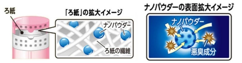 この特許技術は消臭芳香剤「消臭力 玄関・リビング用」や「消臭力 トイレ用」に採用されています。ろ紙に配合されているナノパウダーは、ナノレベルの孔(あな)を持つ消臭剤で、この孔がさまざまな悪臭をすばやく強力に吸着することで、お部屋の複合臭やトイレ特有の尿のしみつき臭など、イヤなニオイを消臭しています。