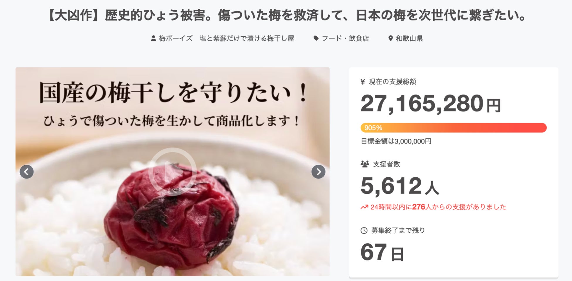 本キャンペーンに先立ち、CAMPFIREでは既に国産梅の需要維持を目的とした取り組みが始まっています。