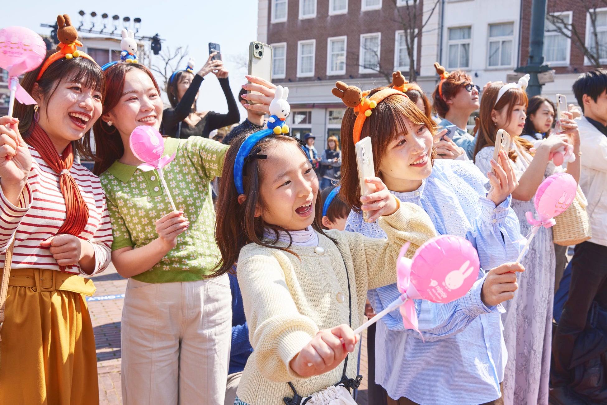 かわいらしい音楽と共に、会場に「ミッフィー」「メラニー」と、呼ぶ声が響き渡ります。すると、ミッフィーとメラニーが登場し、会場一帯から「カワイイ」の歓声が上がりました。ステージに登場したミッフィーとメラニーが「みんな、こんにちは。」とご挨拶。ゲストは、グッズやスティックバルーンを振って、ふたりのご挨拶に応えました。そして、ミッフィーとメラニーが「ドキドキとワクワクが詰まった、ハウステンボスの春、スタート」と開幕の宣言をすると、音楽に合わせてオレンジカラーのバルーンが青空に上がりました。ゲストたちは、バルーンを見上げながら「わぁー」や「すごーい」などの声を上げワクワクしている様子が見受けられました。バルーンが華やかに上がった後、ミッフィーとメラニーのフォトタイムに。ゲストは、思い思いに自分の好きなアングルで撮影を楽しんでいる様子で、ヨーロッパの街全体がカワイイに包まれた、笑顔溢れるひと時を満喫していました。