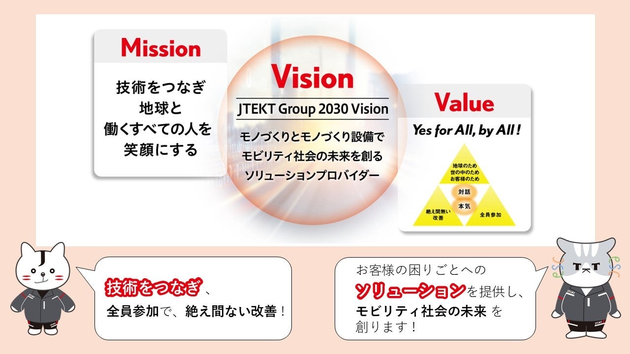 ジェイテクトグループは「技術をつなぎ、地球と働くすべての人を笑顔にする」というミッションに基づき、2030年までに目指す姿としてJTEKT Group 2030 Vision「モノづくりとモノづくり設備でモビリティ社会の未来を創るソリューションプロバイダー」を掲げています。このソリューションプロバイダーへの変革のために、既存製品の高付加価値化と新領域へのチャレンジの両軸での企業活動に取り組んでおります。