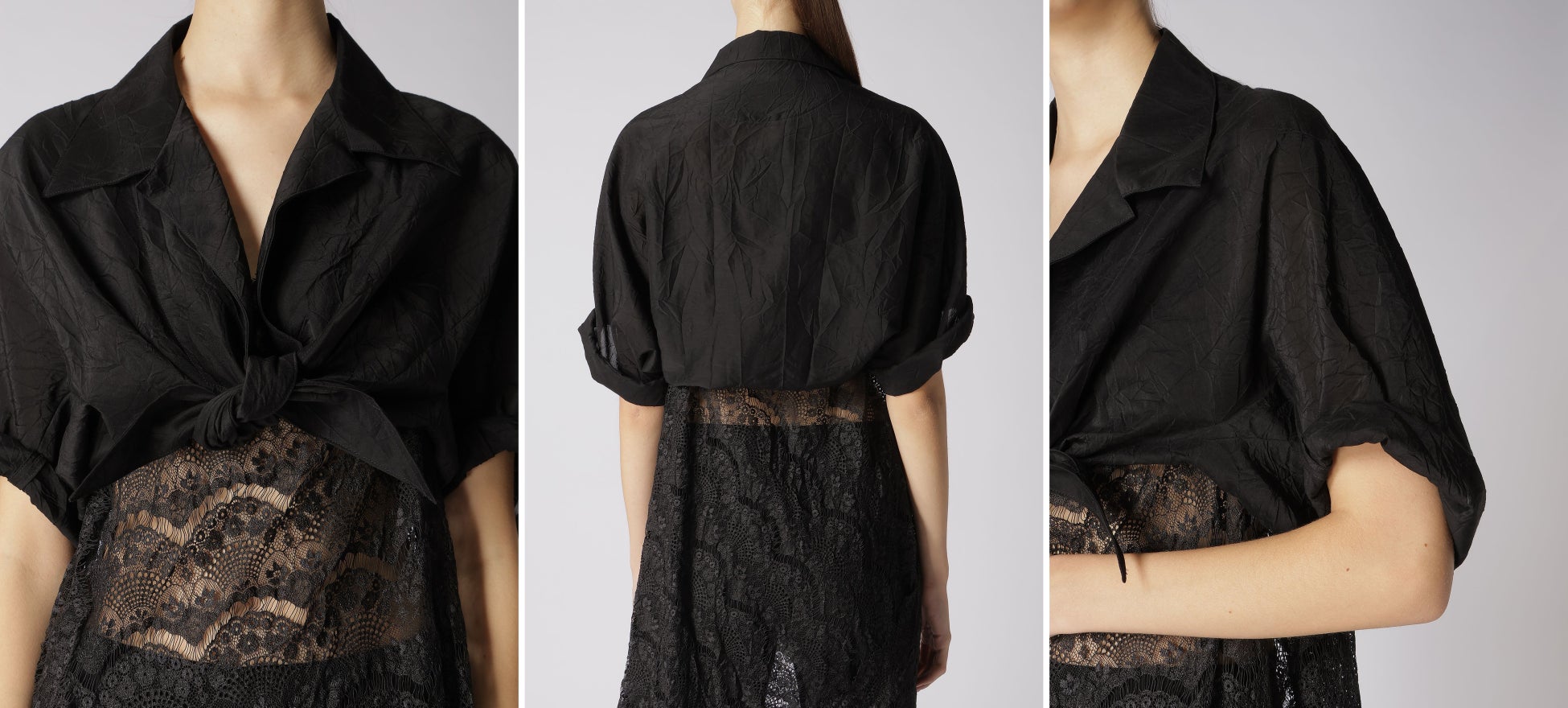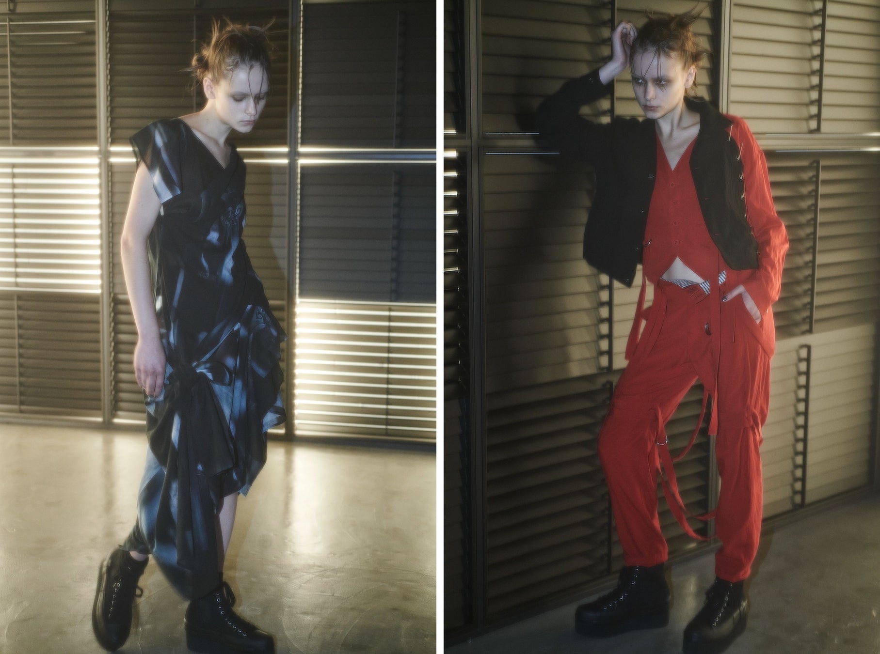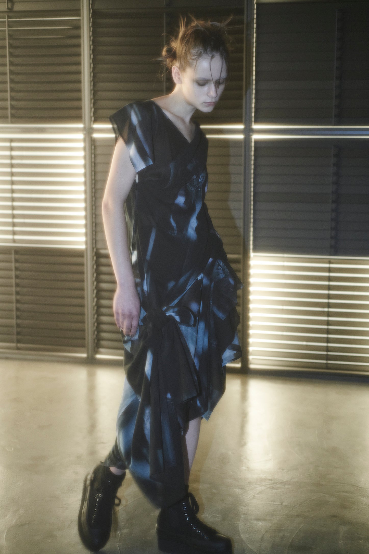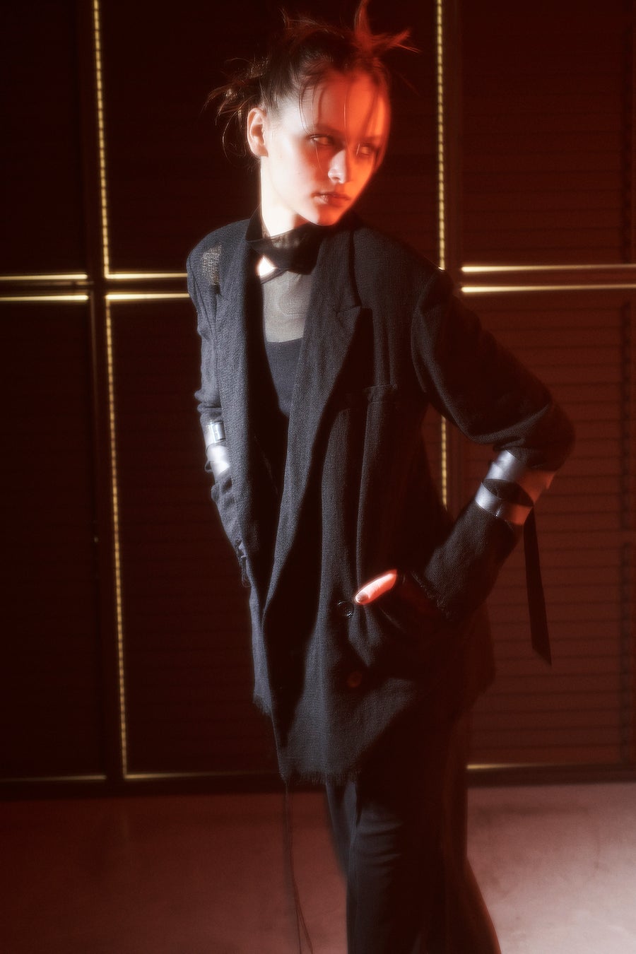 影の層と光の層、それぞれに存在するレイヤーとグラデーションの残像。肌と生地が互いに発する翳りと光が織り成す世界観。常に自分はどう思うのか、問い続ける女性の姿を表現。