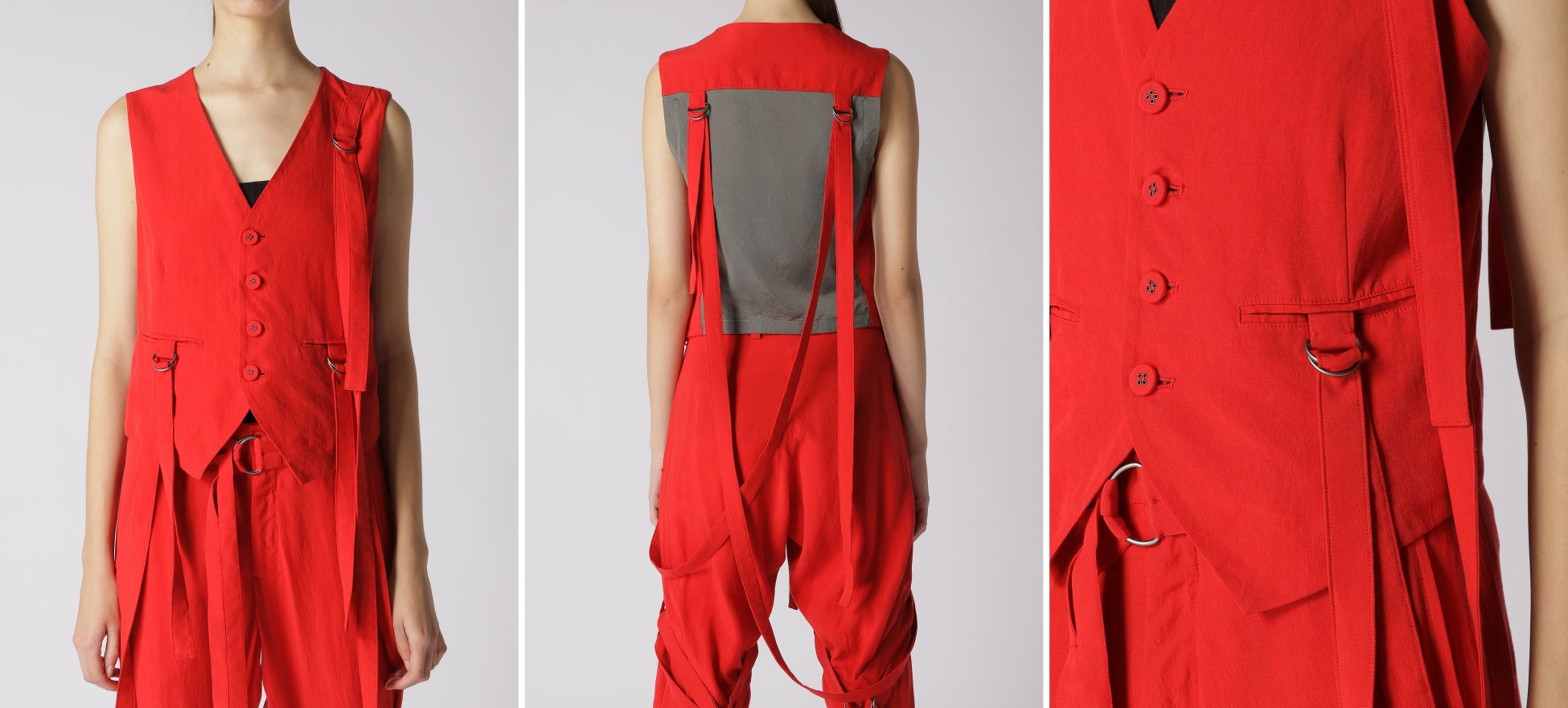 左ショルダーと両ポケットからロングドローコード、バックスタイルは赤×グレートのバイカラー