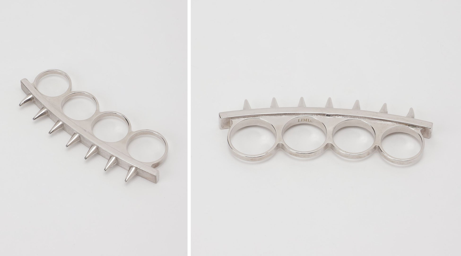ナックルダスターにコーンスパイクのスタッズ、リング内側にブランド名刻印、真鍮