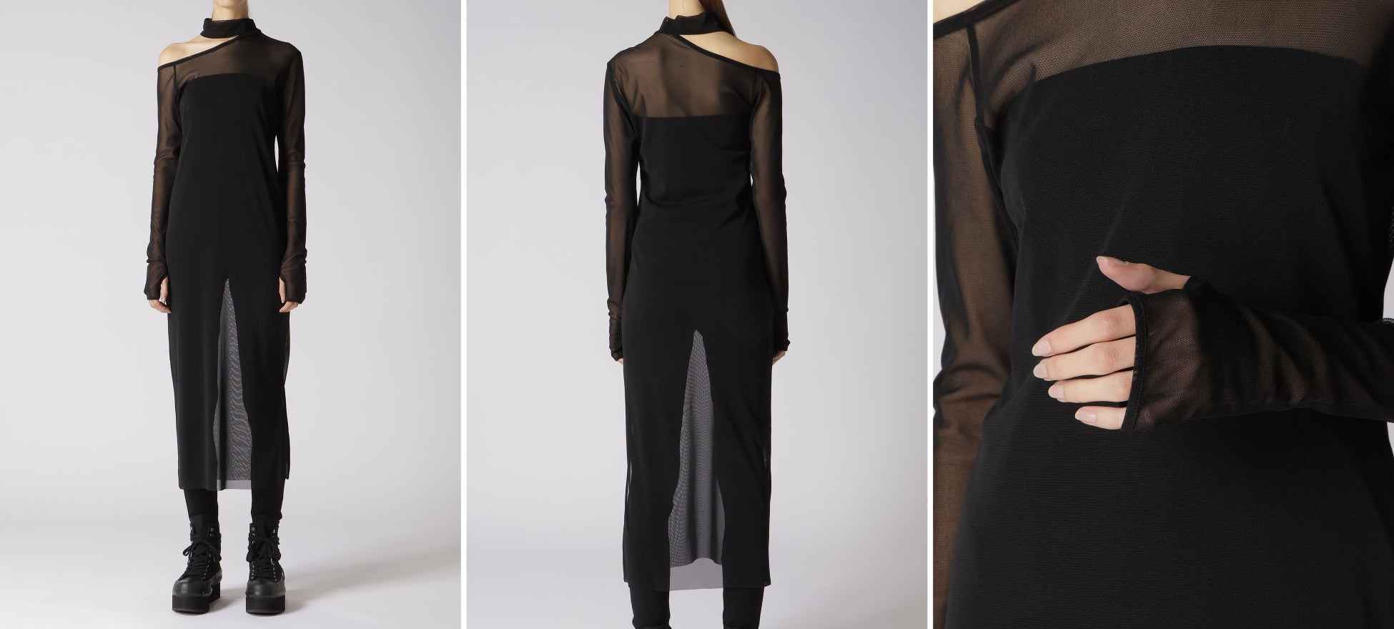 メトリーなヘムライン、前身頃の結びディティール、左脇にファスナー、コットンシフォン