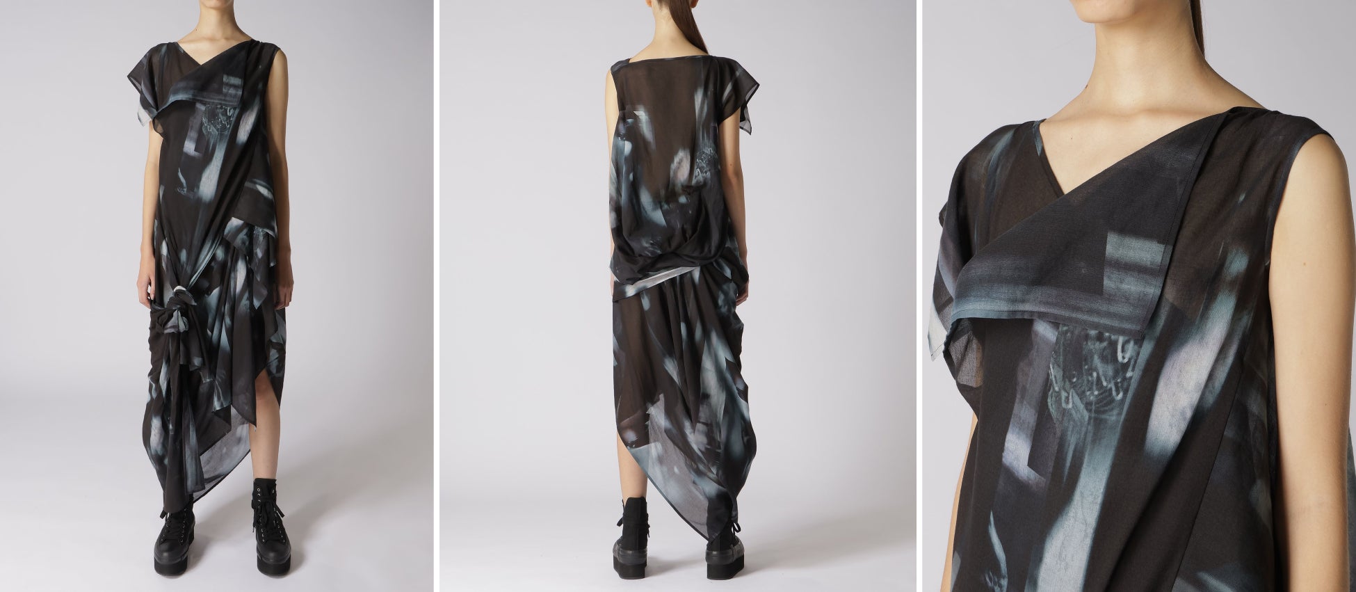 仕上げたドライブ感あるプリント、アシンメトリーなネックラインとスリーブ、アシン