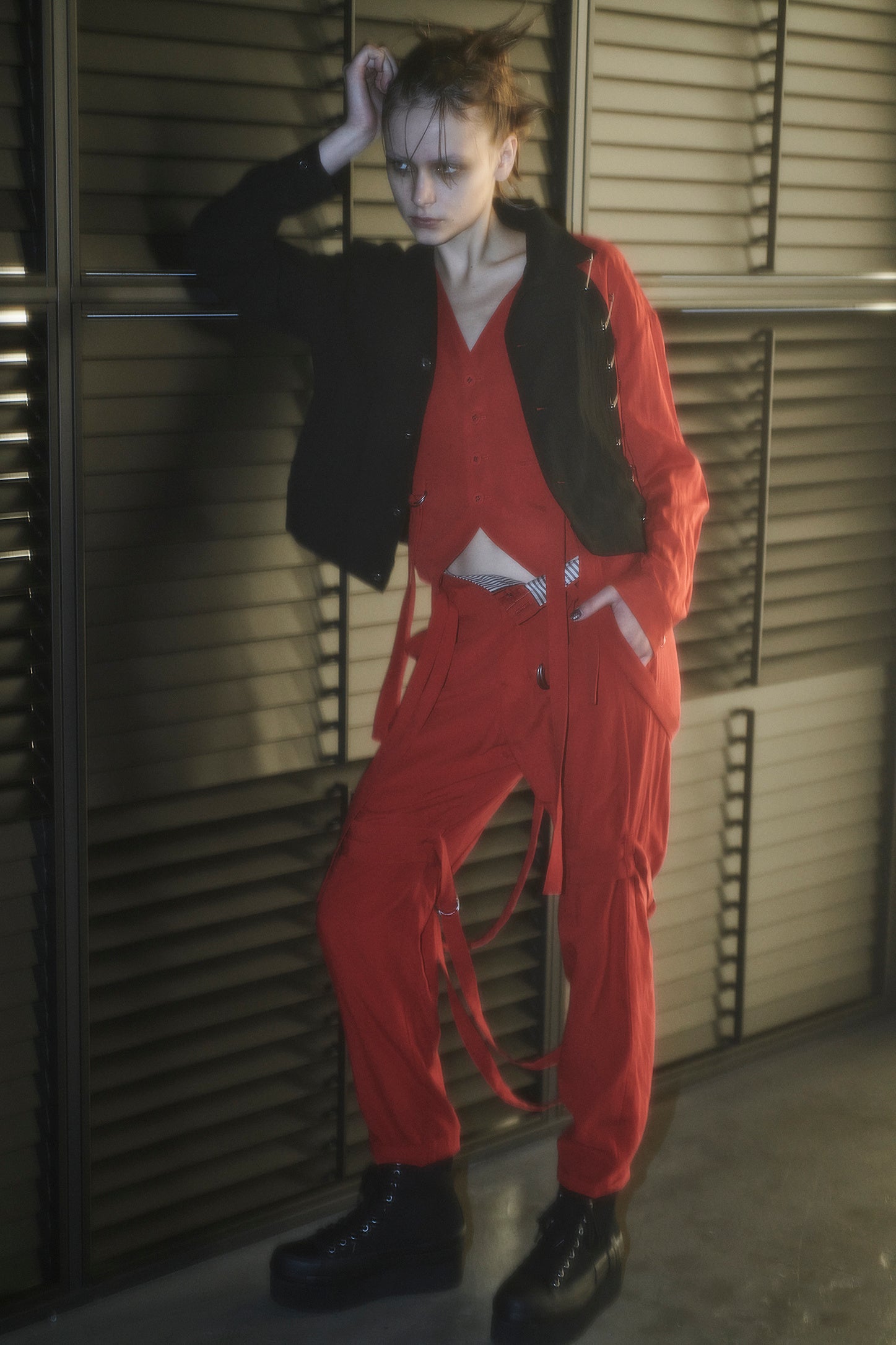 LIMI feuのfeu(火)に因んだ赤、右前身頃にポケット、左身頃にラグランラインのディティール、