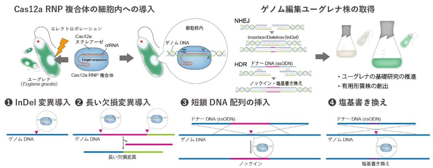 共同研究グループは、すでに確立していたCas9 RNP複合体を用いたゲノム編集技術に加え、標的配列の認識ルールや切断様式が異なるCas12a (Cpf1) RNP複合体を用いた高効率ゲノム編集技術を確立しました。加えて、合成した一本鎖DNAを用いることにより、1塩基レベルでの精密な塩基書き換えが可能であることを実証しました。従来法では難しかったATリッチ領域[2]を標的としたゲノム編集による遺伝子機能解析や、1塩基レベルの書き換えによるタンパク質の精密なエンジリニアリングといったユーグレナの分子育種[5]に貢献すると期待できます。