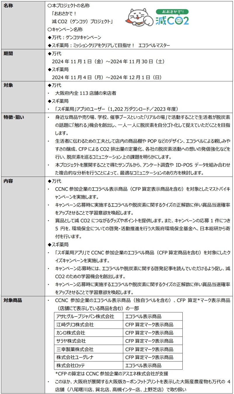 全15社が参画するCCNCは、2024年11月から、株式会社万代(以下「万代」)の大阪府内全113店舗と、株式会社スギ薬局(以下「スギ薬局」)が運営する「スギ薬局アプリ」で、生活者の脱炭素に配慮した購買行動を促すプロジェクト「おおさかで!減CO2(ゲンコツ)プロジェクト」(以下「本プロジェクト」)を開始します。本プロジェクトでカンロはCFP※算定マーク商品である「カンロ飴」、「健康のど飴たたかうマヌカハニー」、「カンデミーナグミスーパーベスト」の3品を展開します。(※CFP=カーボンフットプリント)