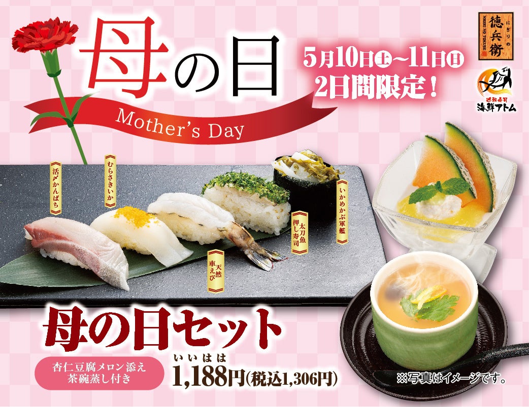 コロワイドグループの株式会社アトム(本社:神奈川県横浜市 代表取締役社長:田中公博)は、回転寿司業態の「にぎりの徳兵衛」「海鮮アトム」の各店で、2025年5月10日(土)・11日(日)の2日間限定で「母の日セット」を販売します。