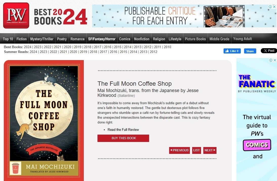 愛されて50万部!『満月珈琲店の星詠み』が、米国「Publishers Weekly」誌が選ぶ「Best Books2024」に選出されました!