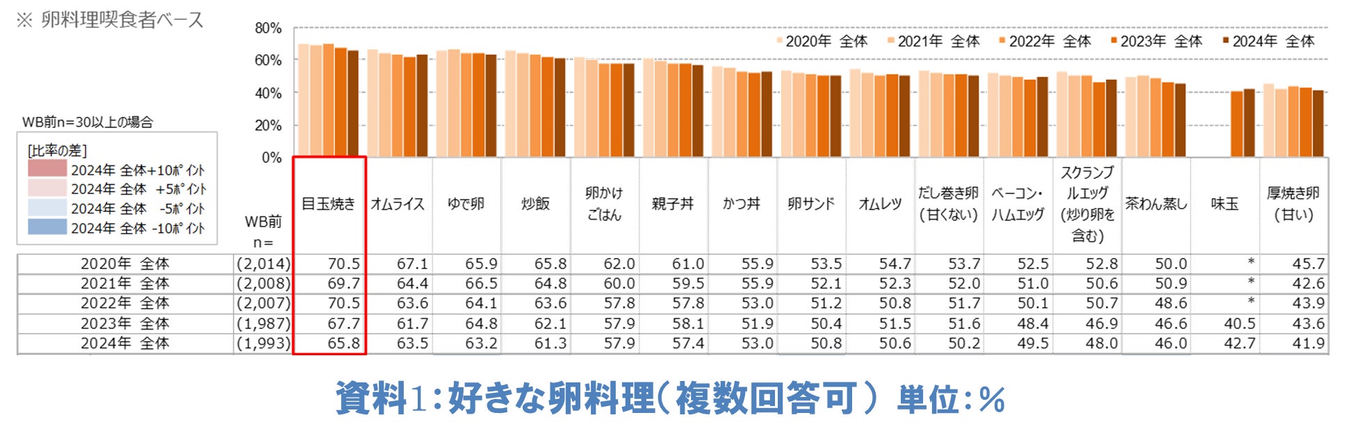 「好きな卵料理」について尋ねたところ(複数回答可)、「目玉焼き」が65.8%と最も多く、6年連続で1位となりました。2位は「オムライス」で63.5%、3位は「ゆで卵」で63.2%でした。「オムライス」は2021年以降3位でしたが今年は僅差で2位でした(資料1)。「目玉焼き」は「好きな卵料理」だけでなく、「よく食べる卵料理」、「1年以内に作った卵料理」でも6年連続1位となりました。