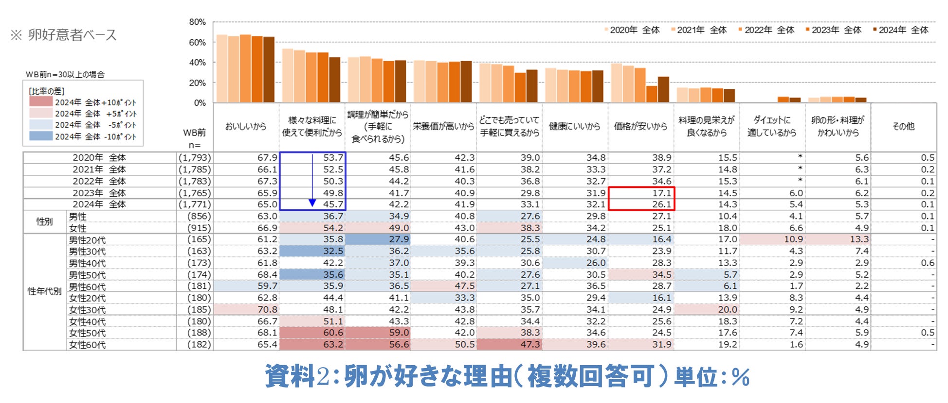 「卵が好きな理由」について尋ねたところ(複数回答可)、「おいしい」が65.0%で最も多く、次いで「様々な料理に使えて便利」が45.7%となりました。前年は鳥インフルエンザによる価格高騰などの影響で「価格が安い」が17.1%に減少しましたが、今年は26.1%と9ポイント増加しており、価格の回復が影響を与えたと考えられます(資料2)。