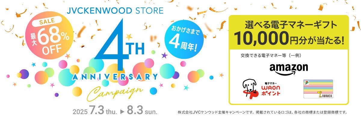 株式会社JVCケンウッドは、公式オンラインストア「JVCケンウッドストア」開設4周年を記念して、同オンラインストアにて「JVCケンウッドストア4周年記念SALE」を実施します。期間中、最大68%オフとなる限定特別価格のほか、抽選による電子マネーギフトのプレゼントや送料無料など、さまざまな特典をご用意しています。キャンペーン期間は、7月3日(木)11:00~8月3日(日)23:59です。