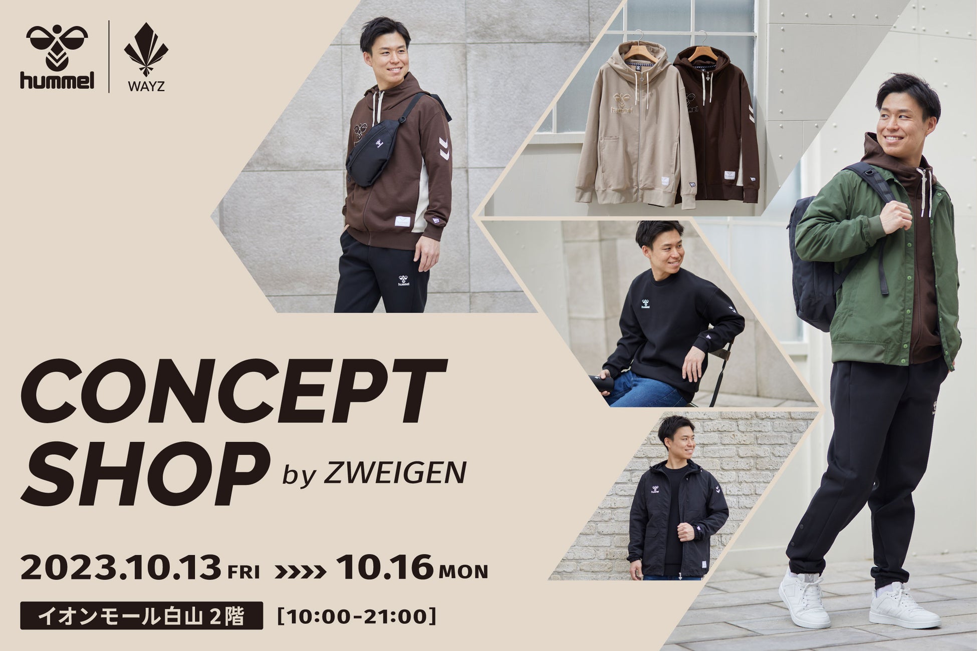 ヒュンメルがサポートを始めた2021年より、hummel×WAYZで出店してきたコンセプトショップが、今回初めて石川県白山市に登場。パブリックビューイングや選手のトークショーなど、ツエーゲン金沢にはなじみのあるイオンモール白山の2Fに4日間限定で新商品やお買い得商品が並びます。