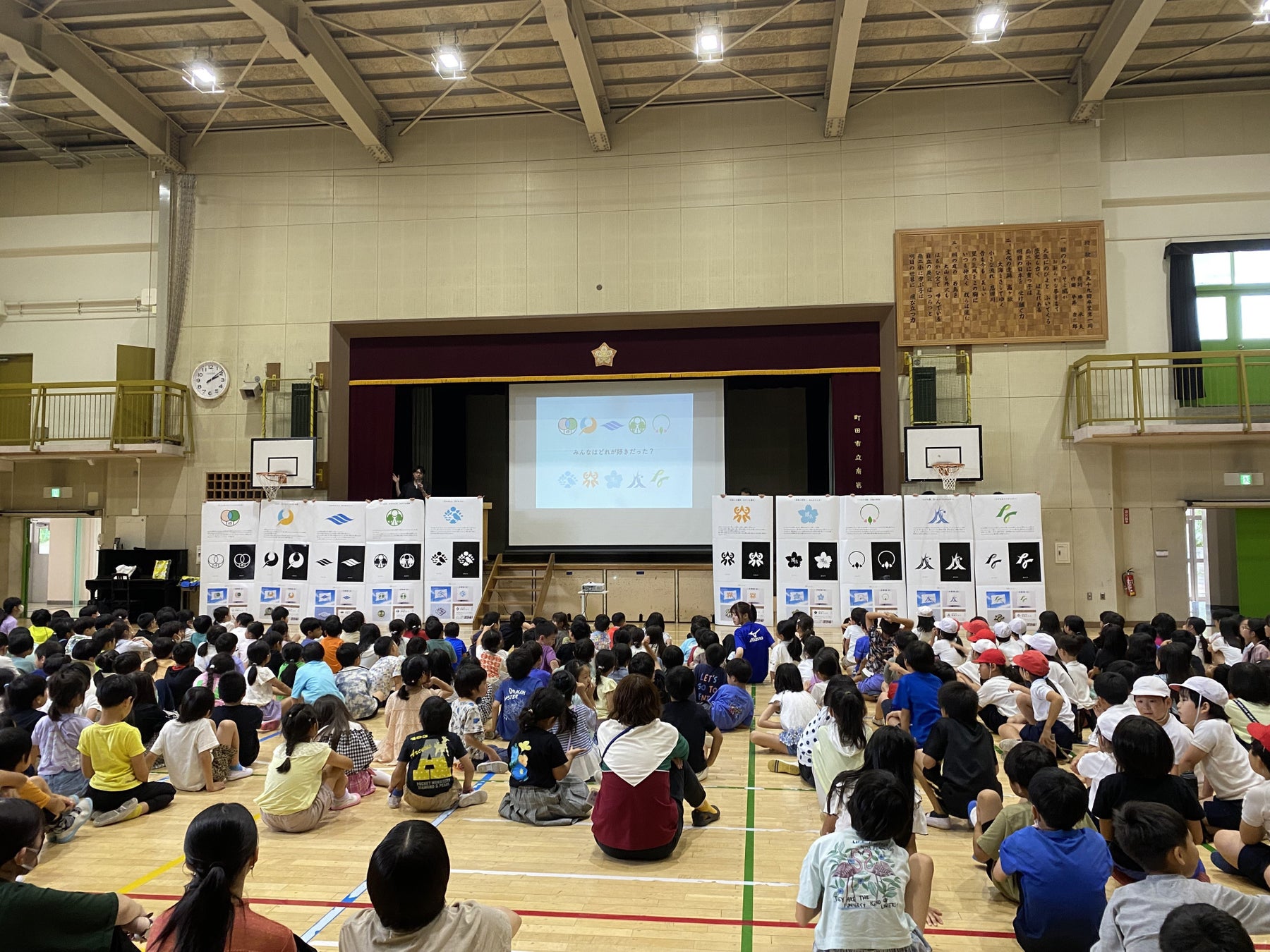 授業の一環として、成瀬小学校の校歌を全校児童で歌唱し、校章を発表します。