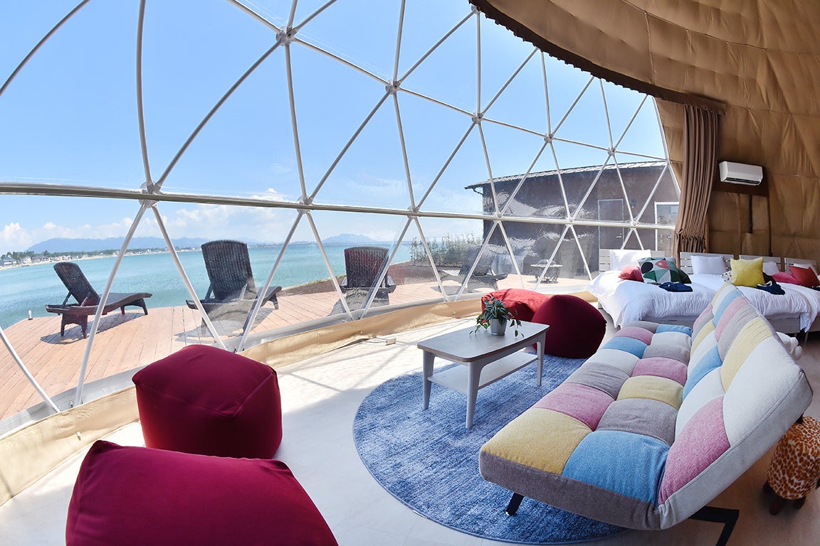 海に囲まれたオーシャンフロントが魅力の「グランドーム福岡ふくつ」。チェックイン後は、食べ放題のジェラート&ソルベや、生豆から焙煎を楽しむコーヒーマルシェ、ピザやポテトチップス作りなど、グランピングならではのグラマラスな体験を一日中満喫できます。