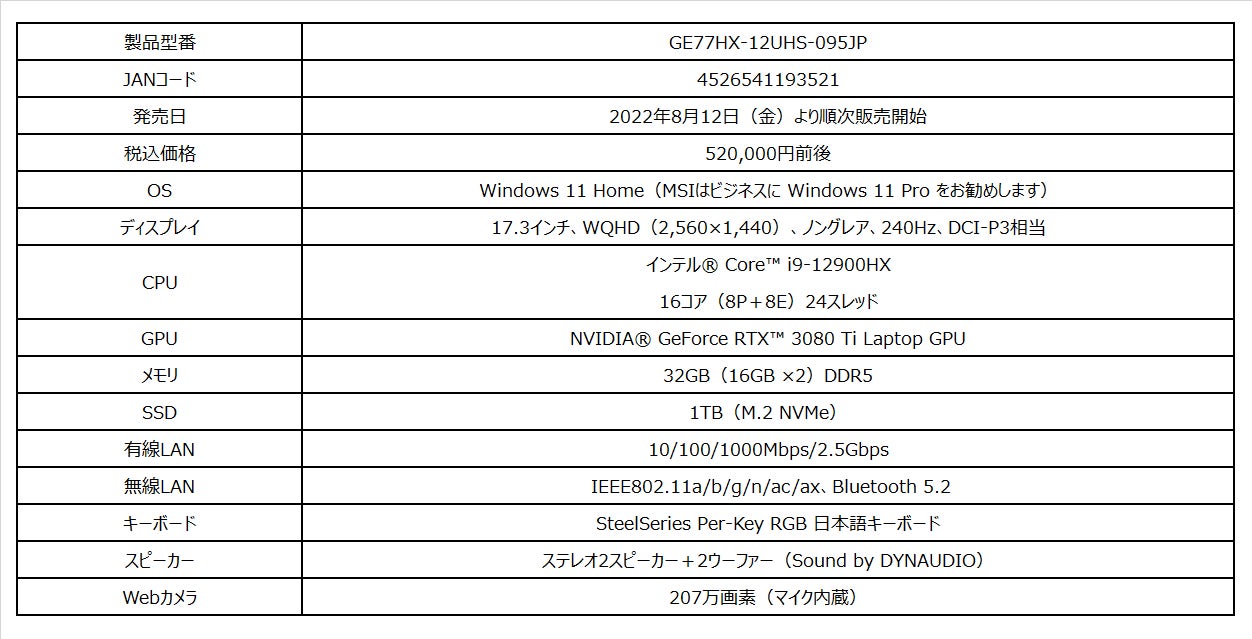 超高性能CPU&GPUと大容量メモリ&SSDを搭載したウルトラハイエンドモデル 「Raider-GE77HX-12UHS-095JP」を発売