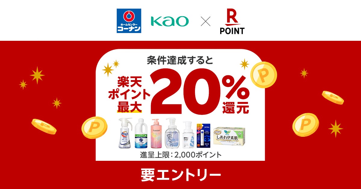 本キャンペーンでは、キャンペーン期間中にエントリーのうえ、「コーナン」の対象店舗(注1)で「楽天ポイントカード」(注 2)を提示して1会計5,000円(税込)以上支払いをした方に、花王の全商品(注3)の購入金額(税込)に対して「楽天ポイント」を最大20%還元します。