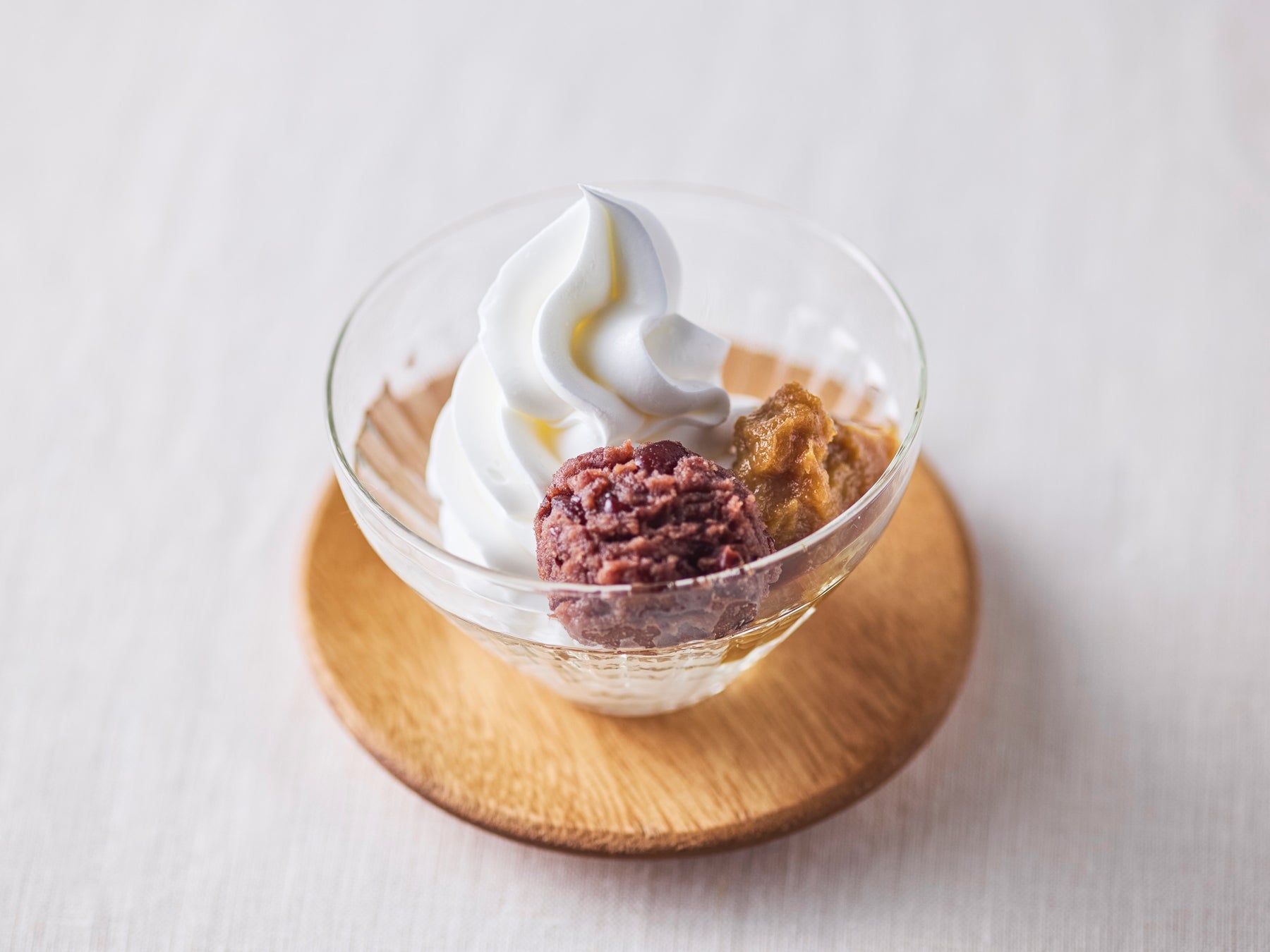 ミルキーなソフトクリームに発酵あんこと、発酵お芋ペーストを添えました。