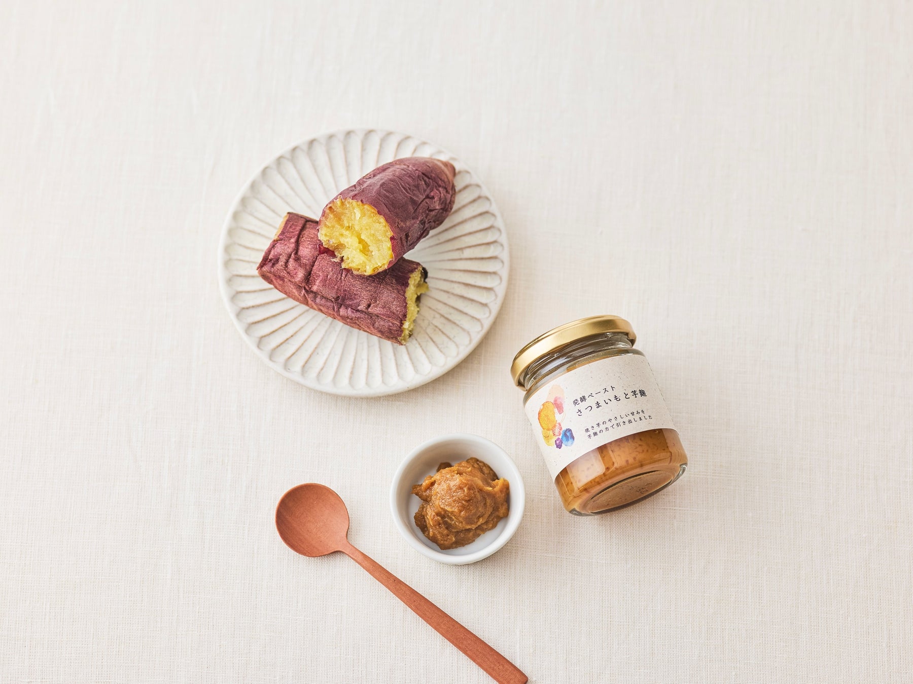 国産紅はるかの焼き芋のやさしい甘みを芋麹のちからで引き出したおいもペースト。パンに塗ったりアイスに添えたり、毎日の暮らしの中で発酵由来のやさしい甘みを。お子さまのおやつにもおすすめです。