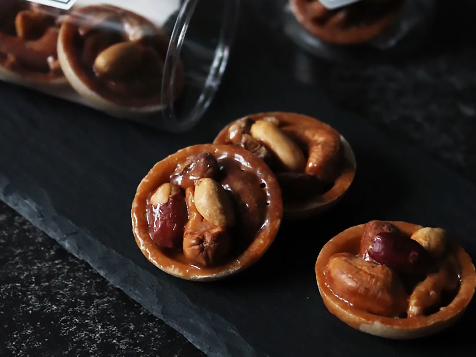 カシューナッツ・くるみ・アーモンド・ピーナッツの4種のナッツを最中に詰め、濃厚なキャラメルソースをかけて焼き上げました。