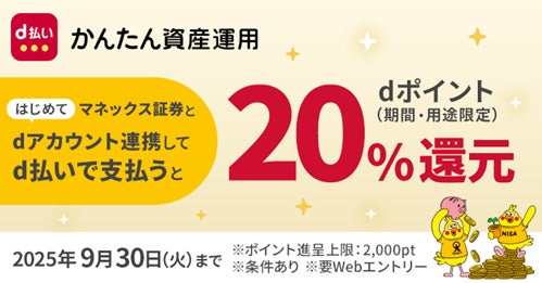 本サービスの提供開始を記念して、ドコモで2025年7月31日(木)~2025年9月30日(火)までの間、「d払い20%還元!マネックス証券口座とのdアカウント連携キャンペーン」を開催します。詳細は、別紙2をご確認ください。