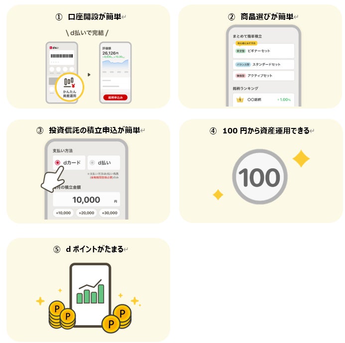 このたび、更なる連携の一環として、「d払い」アプリから最短3分で簡単に口座開設や投資信託の申込み、残高の照会および売却まで一元的に行うことができる、本サービスを提供します。
