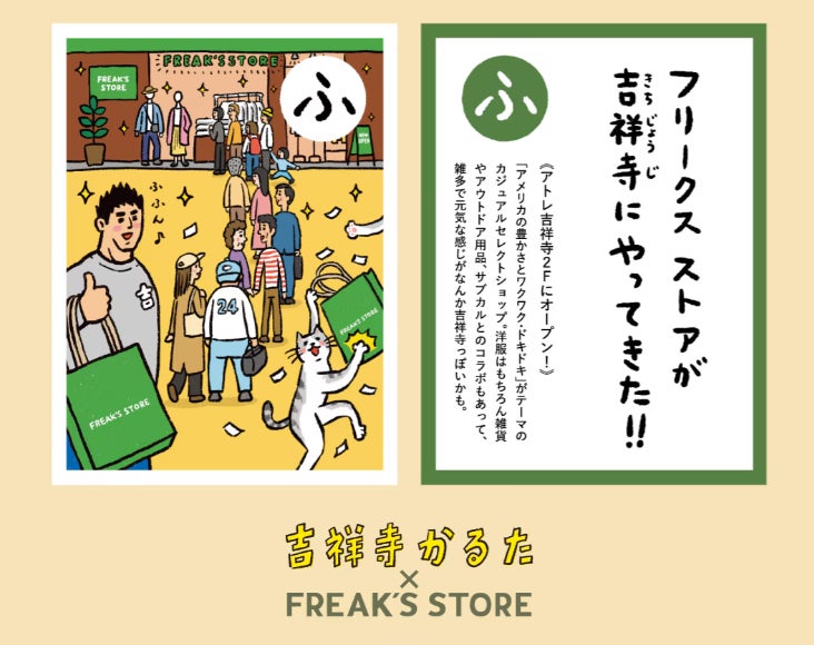 FREAK’S STOREアトレ吉祥寺OPENを記念して、『吉祥寺かるた』との限定コラボアイテムを展開! ここでしか手に入らないポップなアイテムや、コラボアイテムご購入でもらえる「かるたケースにもなるポーチ」もご用意しております。※ノベルティは無くなり次第終了