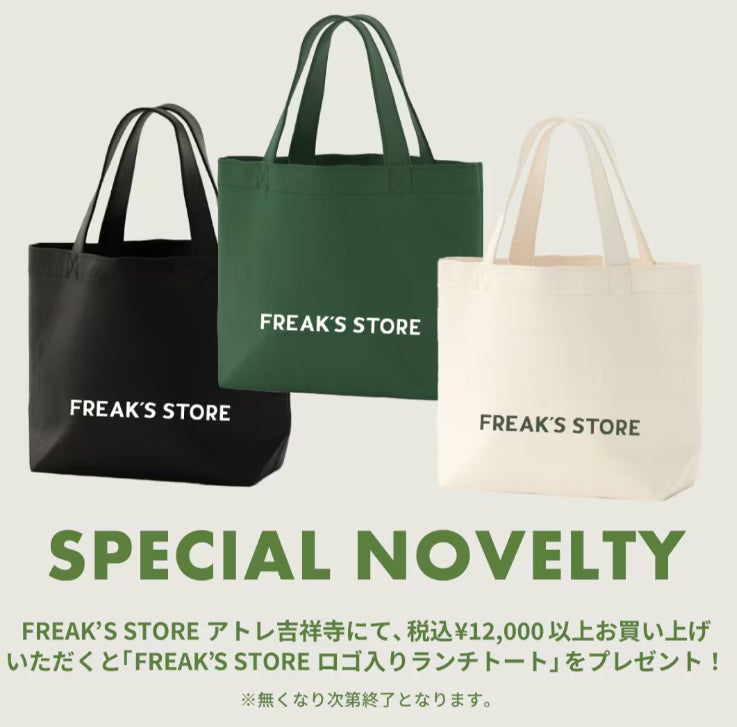 FREAK’S STOREアトレ吉祥寺にて、税込¥12,000以上お買い上げいただくと「FREAK’S STOREロゴ入りランチトート」をプレゼント!