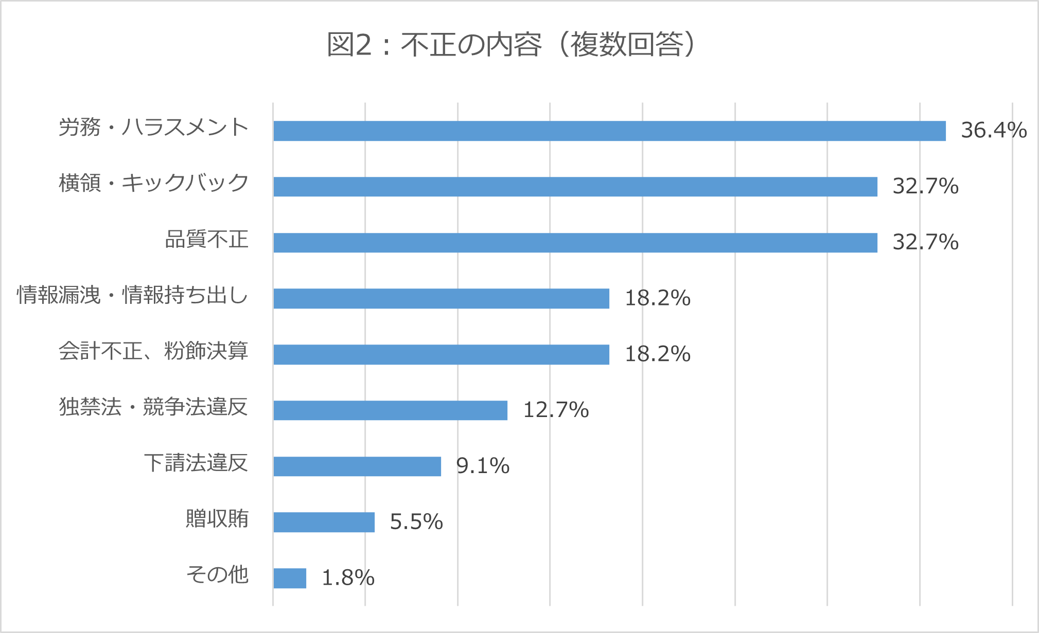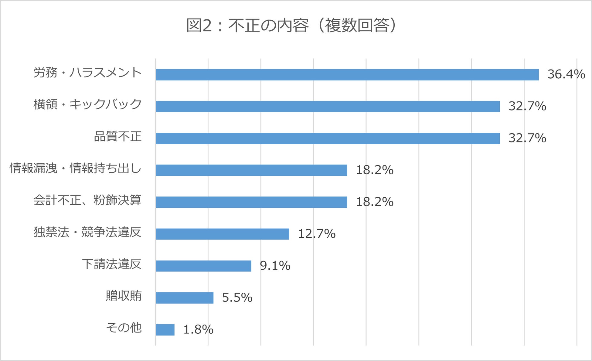 回答者のうち、24.6%が過去5年以内に社内で外部調査が必要な「不正」が発生したことがあると回答しました(図1)。発生した不正の種類(複数回答)は「労務・ハラスメント」が最も多く36.4%、次いで「横領・キックバック」ならびに「品質不正」が32.7%、「情報漏洩・情報持ち出し」ならびに「会計不正、粉飾決算」が18.2%に上りました(図2)。