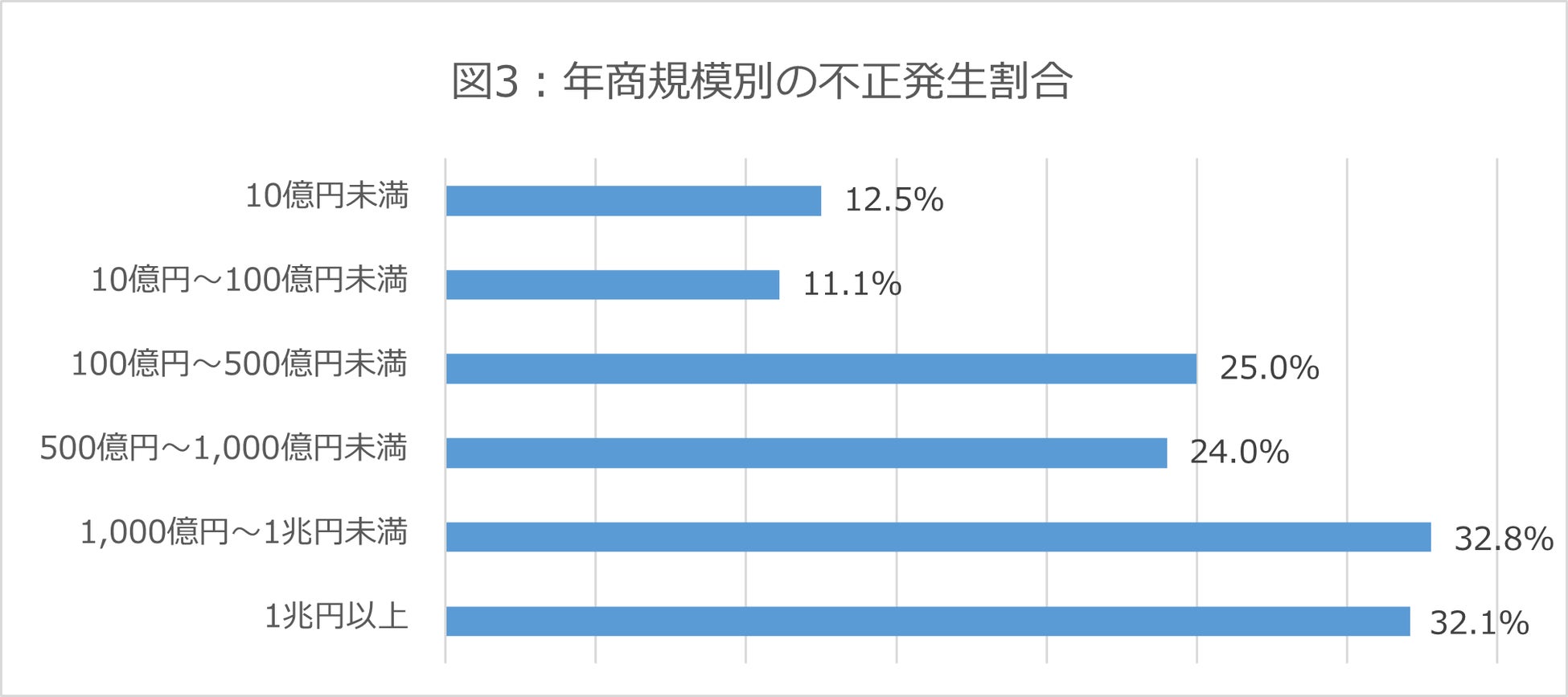 年商規模別に不正発生割合を見ると、年商規模100億円未満の企業では不正発生率が10%強である一方、100億円以上の企業では20%台、さらに1000億円以上の企業は30%台に上昇し、年商規模が大きくなるほど不正発生率が高まる傾向があることがわかりました(図3)。