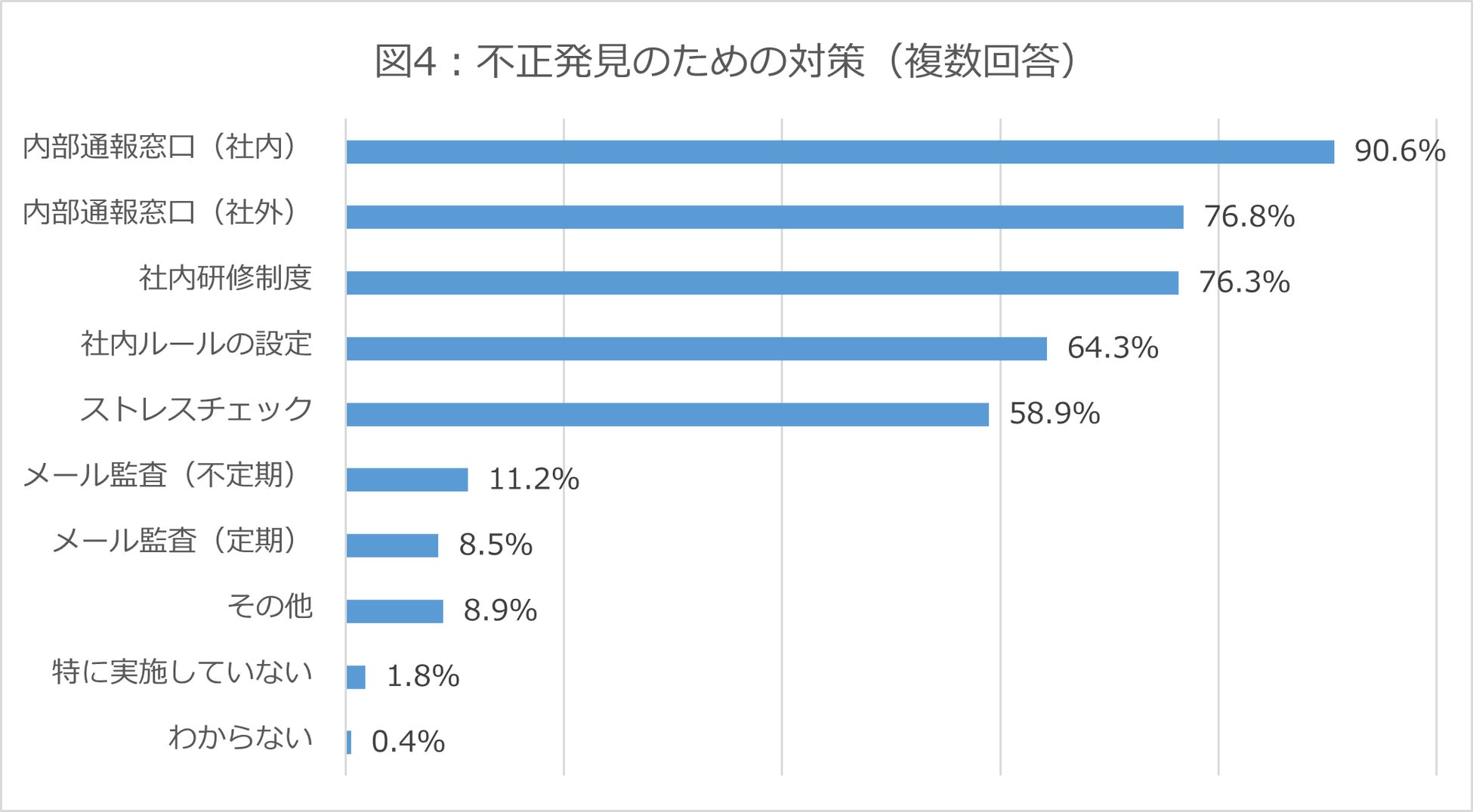 不正発見のための対策としては、回答者の9割超が社内の内部通報窓口を設けているとしたほか、「社外の内部通報窓口の設置」76.8%、「社内研修制度の実施」76.3%などが多く挙げられました(図4)。また、近年導入が進みつつあるメール監査については、約1割の回答者が導入しているとしました。