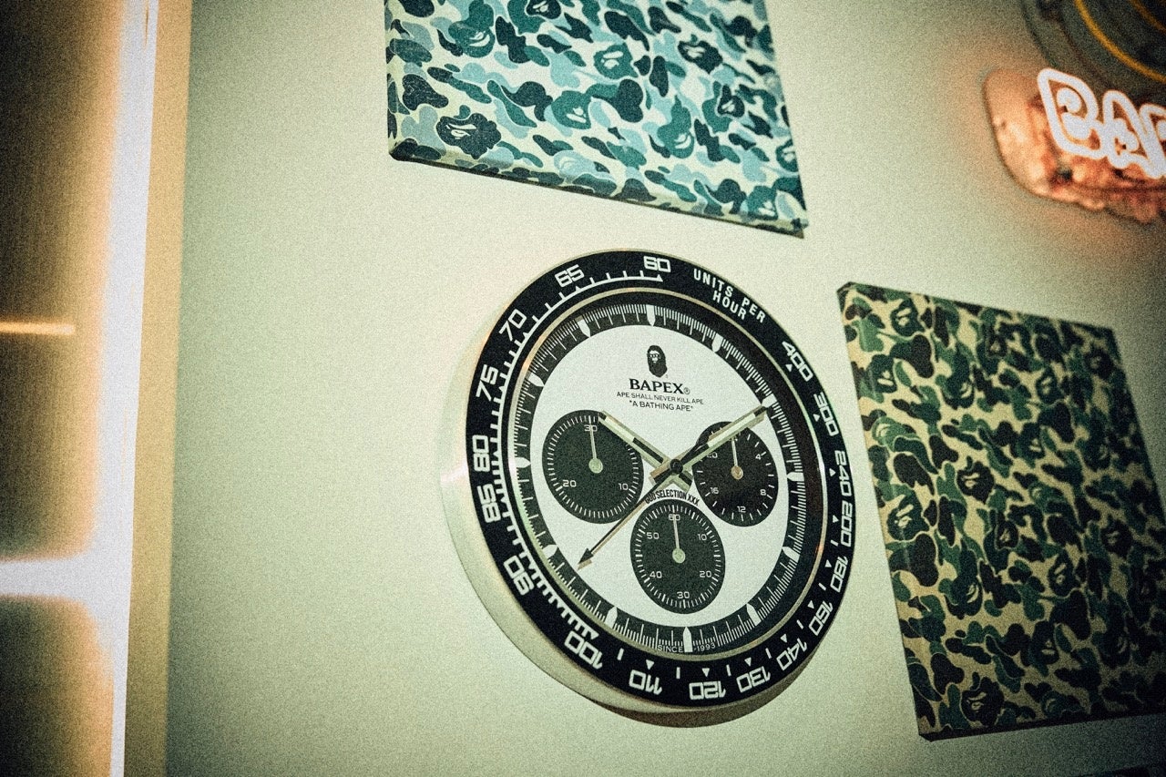 BAPEX™️型ウォールクロックやBAPE®︎ BEEキーホルダーもラインアップ。目線を隠したAPE HEADがコラボレーションを象徴します。