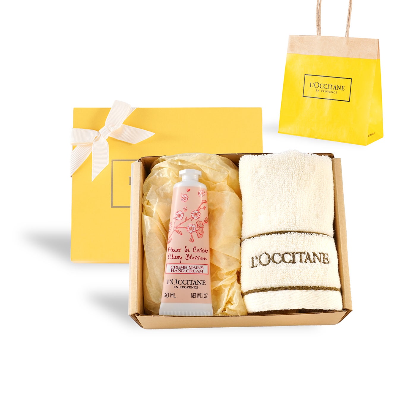 気持ちがほっとするやさしい桜の香りのハンドクリームと、ブランドオリジナルのハンドタオルのセット。お出かけ時も便利なサイズで、