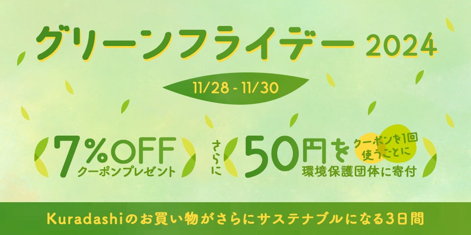ソーシャルグッドマーケット「Kuradashi」を運営する株式会社クラダシ(本社:東京都品川区、代表取締役社長CEO:河村晃平、以下「クラダシ」)は、3つのキャンペーン特典をご用意した「グリーンフライデー2024」を11月28日から開催します。