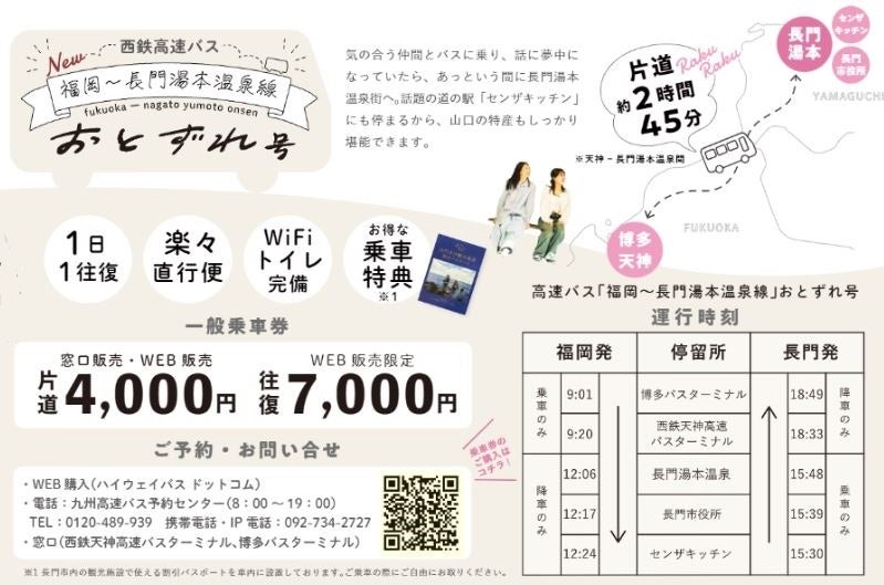 西鉄高速バス「福岡~長門湯本温泉線(おとずれ号)」の往復乗車券と、長門湯本温泉で使えるクーポンがセットになったお得な乗車券。