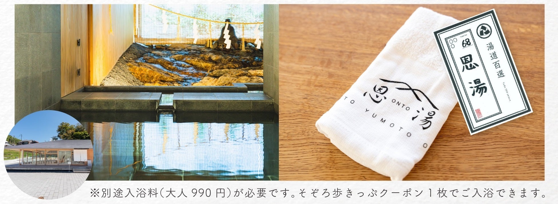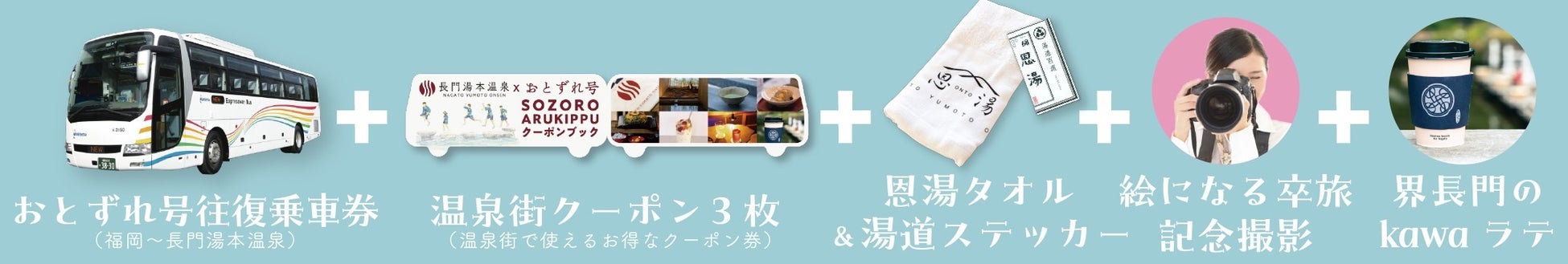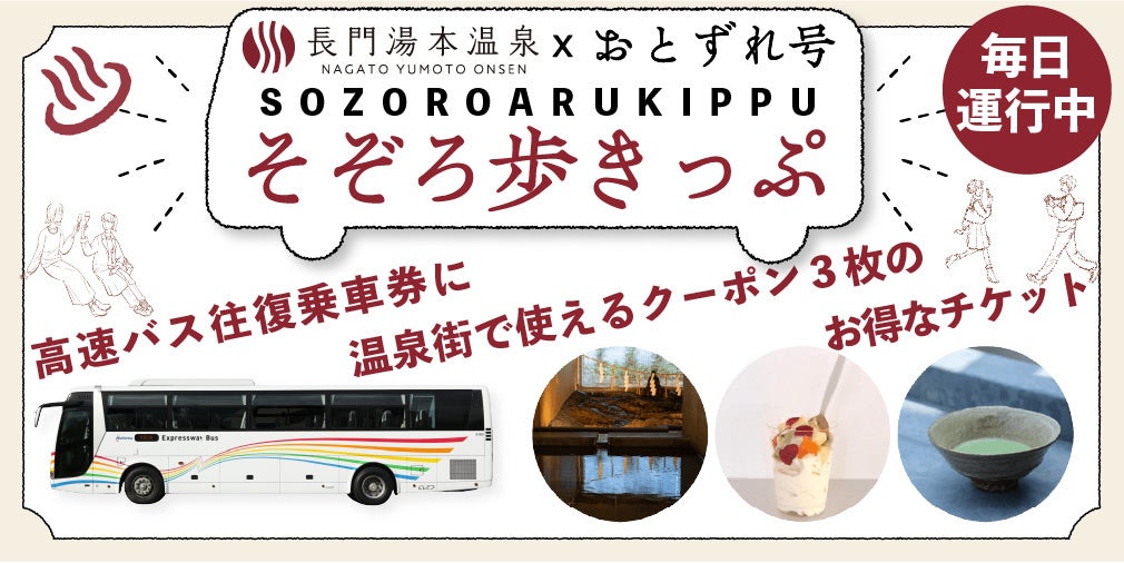 福岡から運行する高速バス「おとずれ号」の往復乗車券と最大約2,500円分のクーポンがセットになった「そぞろ歩きっぷ」をはじめ、星野リゾートの温泉旅館「界 長門」では"そぞろ歩き"を楽しむためのカフェラテの提供、また温泉街のシンボルでもある「恩湯」の湯道文化賞受賞を記念してオリジナルタオルとステッカーをプレゼントいたします。