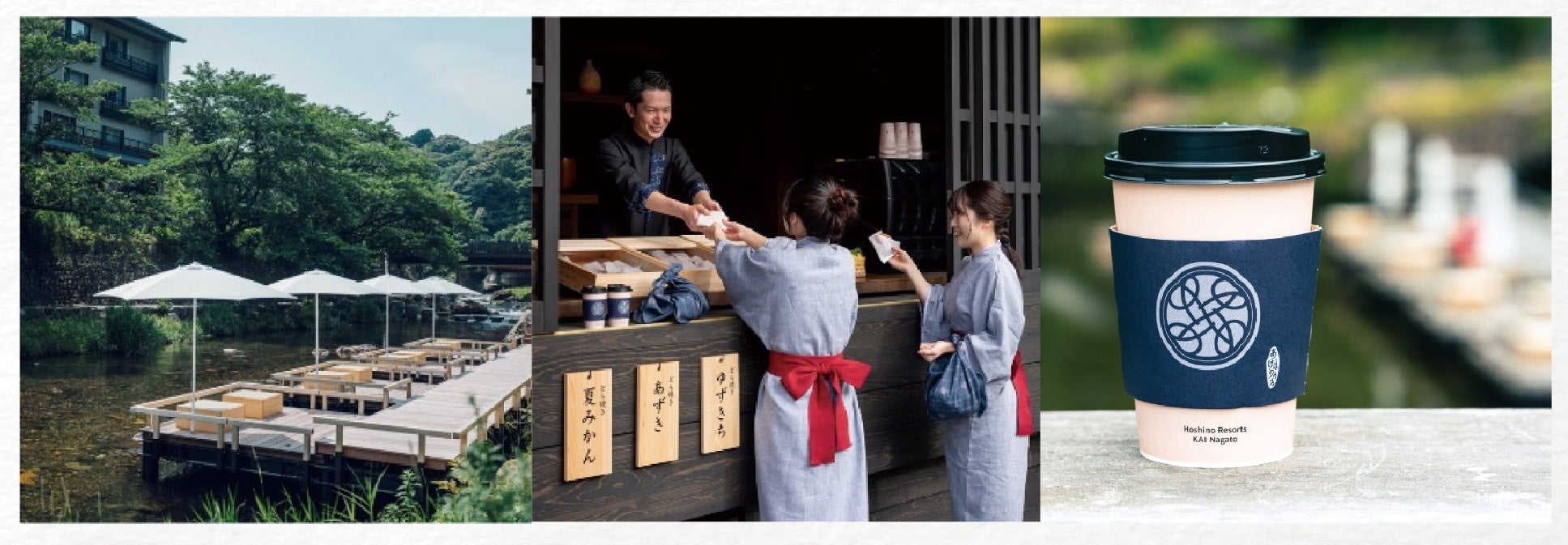 界 長門では、キャンペーンに当選された方に向け、音信川の水面に設えた、「川床テラス」で楽しむ「kawaラテ」を用意します。