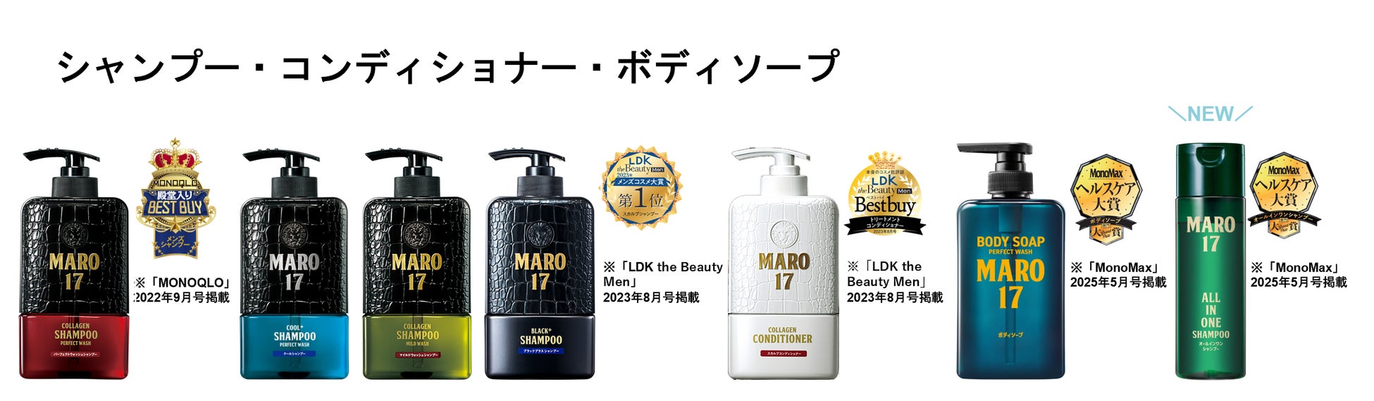 『MARO17』は、あきらめない男のための、頭皮と髪、ボディのために新たな発想を加えて研究・開発されたメンズケアブランドです。独自処方のペプチド(保湿)を配合したシャンプー・コンディショナー・ボディソープ・デオドラントスプレー・デオドラントボディミスト・オールインワンシャンプー・頭皮用エッセンス・ドライシャンプーなど、大人の男性に向けた製品を幅広く展開しており、その独自性や高い実力が評価され、『MONOQLO』『LDK the Beauty』『MonoMax』など多数メディアでアワードを受賞しています。