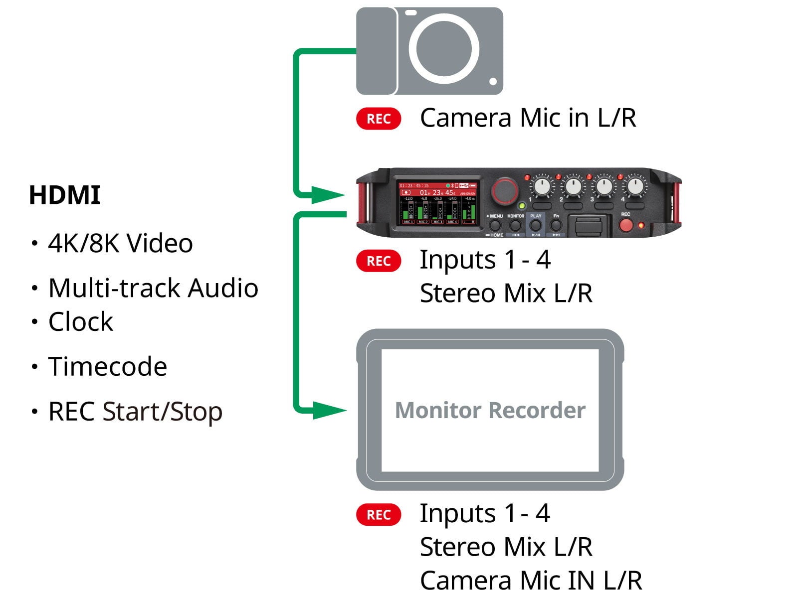 Blackmagic Design、Canon、FUJIFILM、Nikon、Panasonic、SonyなどHDMI端子を搭載したカメラに接続するだけで、タイムコード同期および高精度なクロック同期を実現し映像と音声のズレを防ぎます。さらに、録音のスタート/ストップはHDMI接続したカメラの操作と連動するため、録り逃しの心配はありません。また、FR-AV4のHDMI出力は4K/8Kのビデオパススルーに対応し、Blackmagic DesignやAtomos製のモニターレコーダーとスムーズに連携できます。さらに、複数台のHDMIカスケード接続に対応し8ch以上のマルチトラック収録が可能です。