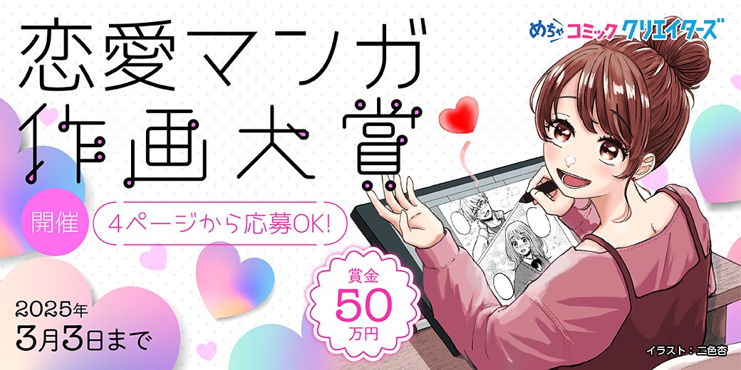株式会社アムタス(東京都港区 代表取締役社長 児玉隆志)が提供する漫画投稿サイト「めちゃコミック クリエイターズ(めちゃクリ)」は、2024年12月16日(月)より「めちゃコミック クリエイターズ 第2回 恋愛マンガ作画大賞」を開催いたします。受賞者には賞金最大50万円を贈呈いたします。