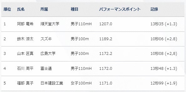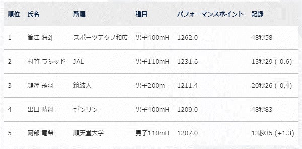 また、1大会のパフォーマンスポイントの合計でグランプリシリーズを通して最も高いパフォーマンスを競う"パフォーマンスランキング"では、第8戦・大阪大会(木南記念)でパリ2024オリンピック参加標準記録を突破した男子400mハードル・筒江海斗(スポーツテクノ和広)が1位をキープ。
