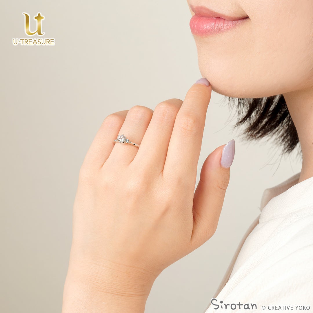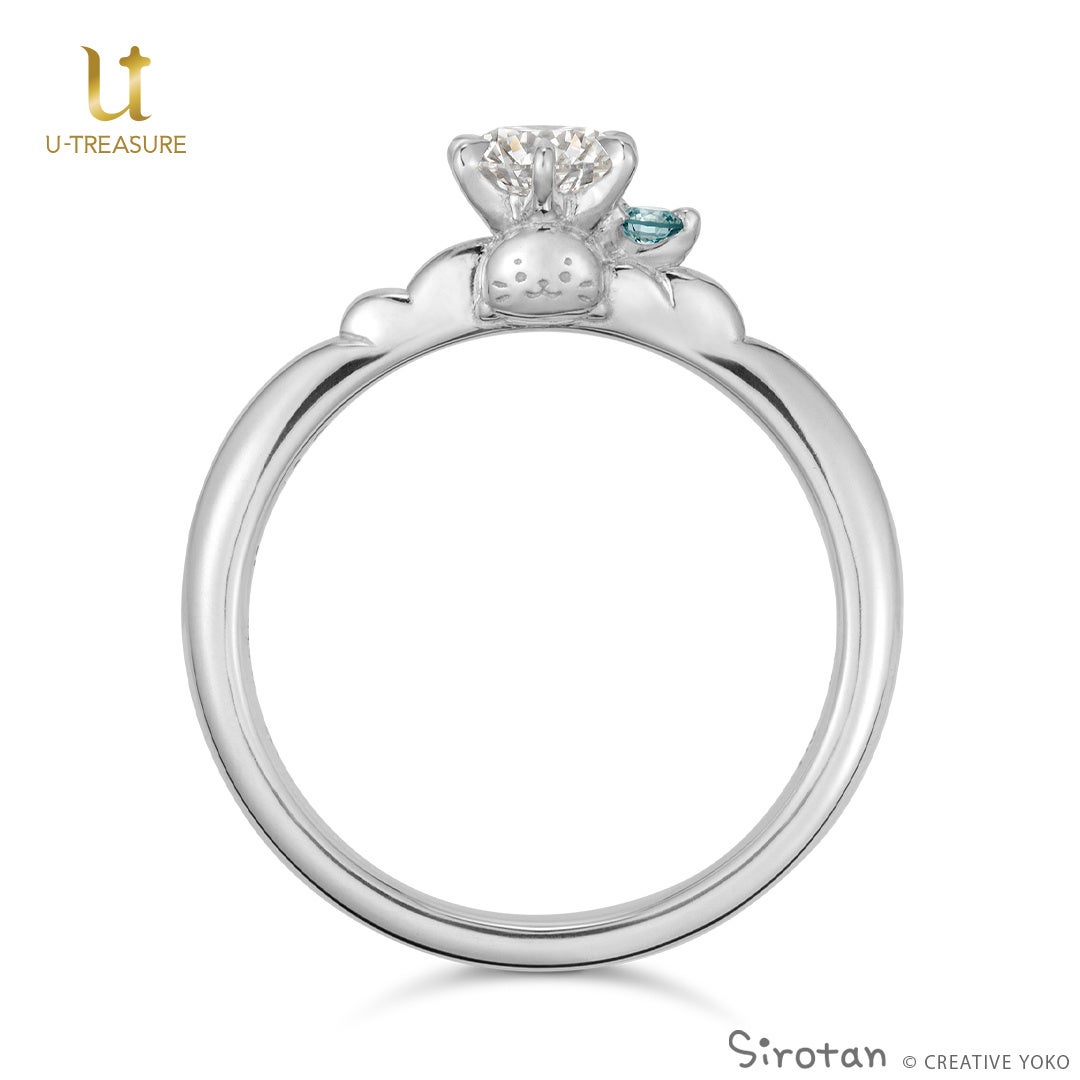 石座の両面それぞれで異なるしろたんの表情が楽しめるエンゲージリング(婚約指輪)と、シンプルながらワンポイントに愛らしいしろたんをあしらったマリッジリング(結婚指輪)2種類の全3種類。手元を見るたびに、大切な想いを感じられ、ほっと癒されるデザインです。